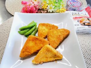 🧑🏻🍳 写真は、”はんぺんのツナサンド”です。はんぺんに切り込みを入れてツナを挟んでフライにしたもの。とっても美味しくてしかも安上がり。パクパク食べられちゃうお奨めの一品です。