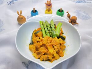 🩷写真は、豚バラ肉とかぼちゃの甘辛煮・・・カボチャの甘みと豚肉の旨味が相まって、ご飯が進む美味しさになります。お子さんからご年配の方まで、みんなに喜ばれる味です。とろっとしたかぼちゃの味わいを楽しんでください。アスパラガスを柔らかくゆでて添えました。