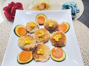 💚①乾燥ッシュポテトに沸騰した湯を少しずつ加えてゴムベラなどで混ぜ合わせていきます。②玉ねぎのみじん切りと角切りベーコンをサラダ油で炒めます。③②を①に加えてよく混ぜ、バター🧈を加えて塩こしょうで調味します。④丸く形作り、フライパンにサラダ油を引いてこんがりと両面焼きます。⑤ズッキーニとにんじん🥕の薄切りをフライパンの端で焼き、コーン🌽も炒めます。⑥皿に盛りつけます。そのままでも充分に美味しいですが、ケッチャプやソースをつけても⭕。