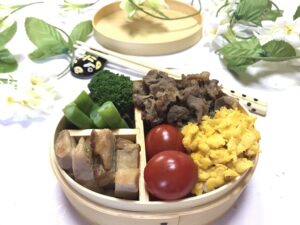 💖写真左下から、かじきの味噌漬け焼き ブロッコリーとアスパラガスのソテー 牛肉のしぐれ煮 炒り卵 ミニトマト