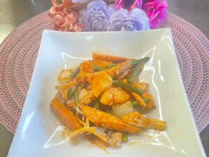 💚たけのこは、味に癖がないので色々な調理に向いています。煮物、炒め物、揚げ物、焼き物、炊き込みご飯・・・などなど。レシピは無限大に広がります。写真は『いかと竹の子のオイスターソース炒め』・・いかは片栗粉をつけてサクッと揚げ、玉ねぎ、たけのこと一緒にオイスターソース、しょうゆ、砂糖などで調味して炒めます。ゆでたにんにくの芽を加えてさっと炒めたら出来上がり!。