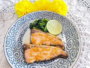 🧡写真は、”ぶりの柚子焼き”です。ぶりの独特の癖が苦手な人も美味しく食べられる”ゆず”を使った逸品。刻んだ柚子の皮をしょうゆベースのタレと合わせ、ぶりをしばらく漬け込みます。水気を切ってグリルで焼き、皿に盛って煮詰めたたれをかけます。柚子の香りが食欲をそそります。(お重に詰める場合はタレはかけません)