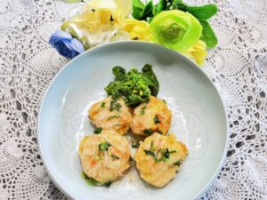 🧑🏻🍳 写真は『豆腐のふわふわ揚げ』 木綿豆腐とはんぺんをすり混ぜ、卵白とカニのほぐし身を加えてまーるくまとめ、からりと揚げました。お子さんからお年寄りまで誰でも好きな味、からし醤油でいただいてもいいし、あんかけにしてもおいしい、お弁当にもいいですよ😊。