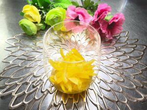 💛写真は、「パプリカのマリネ」・・・黄色パプリカを細切りにして熱湯にさっと通し、甘酢に浸けたもの。パラっと一味唐辛子を振って味にアクセントをつけました。