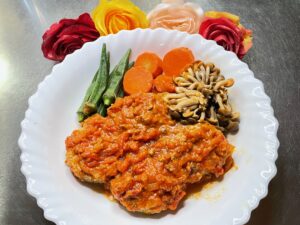💚今日のお料理は”ハンバーグ”、夏が旬のトマトをソースにして冷凍しておきました。粗びきのひき肉で作った肉肉しい?😋ハンバーグにたっぷりかけました。しめじ、にんじん、オクラ、野菜のソテーもソテーして。