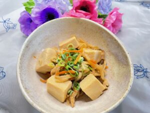 👨🏻🍳 今日の一品は、戻した高野豆腐と同じく戻した切り干し大根をだしで煮て、しょうゆとみりんで調味したものです。味のしみこんだ高野豆腐のおいしさと切り干し大根の歯ごたえを楽しみましょう🥰。