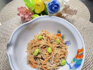 🧑🏻🍳 写真は、”皮付きごぼうのサラダ”🥗です。ごぼうは、よーく洗って皮ごとスライサーなどで細く切り、水にさらします。水を2~3回替えて、にんじんの細切りと共に柔らかくゆでます。熱いうちにマヨネーズ、しょうゆ少々で和え、すりごまをたっぷり加えます。冷凍の枝豆を解凍して加えました。栄養満点、食物繊維豊富な”サイドメニュー”です。ぜひ作ってみてください💁🏻♀️。