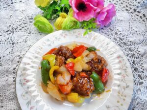 🥩『酢豚』です。野菜は、玉ねぎ、にんじん、ピーマン、黄色パプリカ、赤パプリカ・・・🤍🧡💚💛❤️色とりどり。