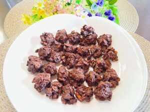 💙コーンフレークに、溶かしバターと卵黄、砂糖、小麦粉少々とココアパウダーを混ぜ、小さくまとめます。150℃の低温のオーブンで、20分ほど、ゆっくり焼きます。(高温で焼くと焦げてしまうのでご注意⚠️。カリッと焼けたら出来上がり!。ほろ苦くて美味しいですよ。